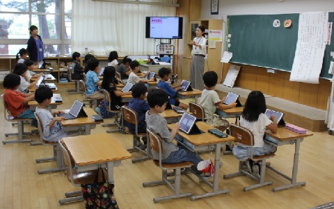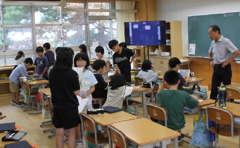 1学期終業式を行いました。校内での熱中症対策の一環として、エアコンのある多目的教室に全校児童が集まって実施しました。校長先生からは、1学期の子どもたちの様子から、「笑顔」が及ぼす心身への効果についてのお話がありました。