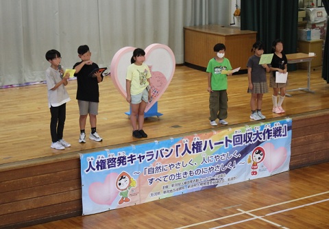新潟県では、県内12カ所の小学校を訪問し、人権に関するイベントを実施することで、児童の人権意識の高揚を図ることを目的として、人権啓発キャラバン「人権ハート回収大作戦!」を実施しています。人権キャラバン隊5カ所目の訪問校が、東小学校でした。まず、児童会のなかよし委員会の子どもたちによる、「人権ハートの回収式」が行われました。
