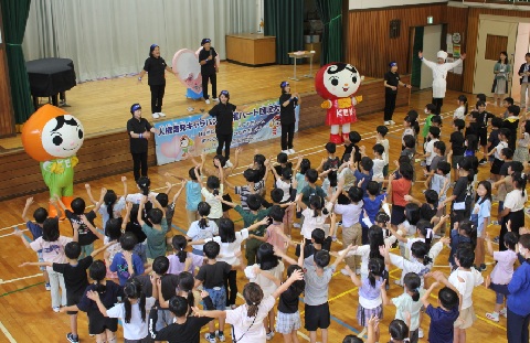 人権イメージキャラクター「人KENまもる君」「人KENあゆみちゃん」と全校児童との記念撮影も行われました。