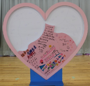 次に、「自然にやさしく、人にやさしく、すべての生き物にやさしく」をテーマにした「心のメッセージ」を各学年代表の子どもたちが発表しました。最後に、心を一つにして「君は虹を見たかい」の歌を体育館いっぱいに響かせました。