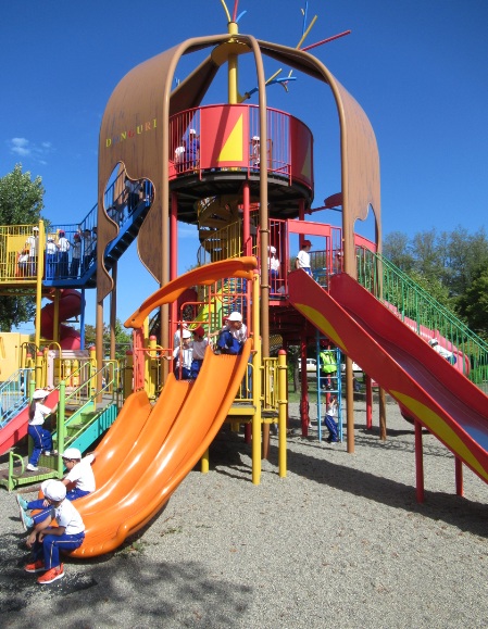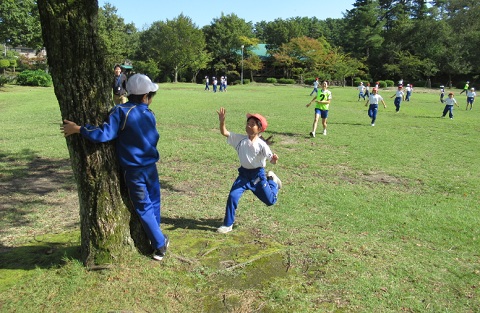 午前中に五十公野(いじみの)公園で全校遠足を行いました。全校縦割り班「ふれあい班」で、各リーダーを先頭に学校から五十公野公園までの道のりを歩きました。公園の芝生広場では、「ふれあい班」のリーダーを中心に考えた遊びを楽しみました。広い芝生の上で1年生から6年生が、「鬼ごっこ」や「だるまさんがころんだ」などを楽しみました。また、五十公野公園にあるアスレチック広場でも、たくさんの大型遊具で楽しく遊びました。